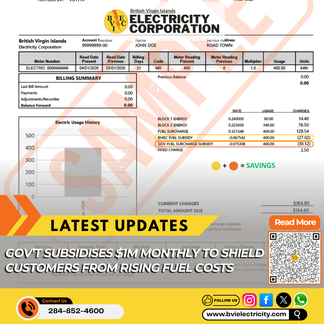 Tortola, British Virgin Islands, April 16, 2026 — The BVI Electricity Corporation (BVIEC) welcomes the decisive action taken by the Government of the Virgin Islands to subsidise electricity costs for customers across the Territory, as part of ongoing collaborative efforts to cushion residents and businesses from the impact of rising global fuel prices.