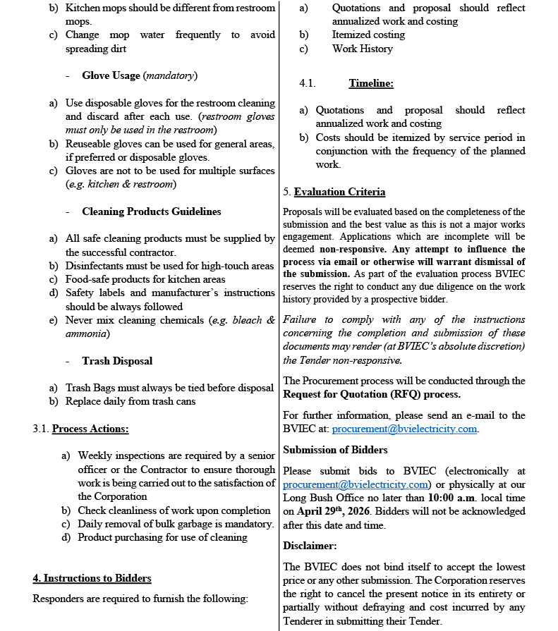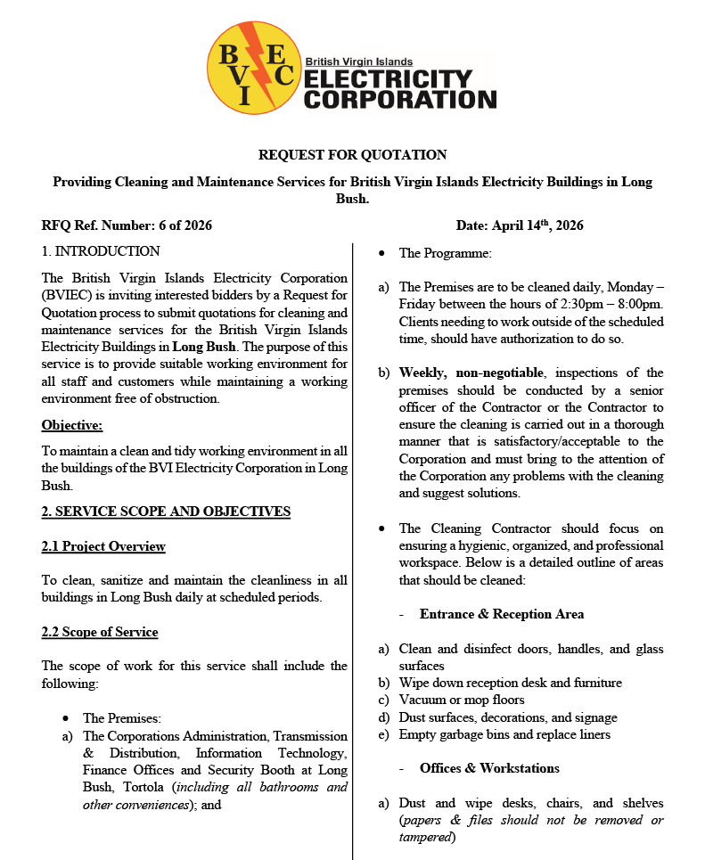 RFQ #6: PROVIDING CLEANING AND MAINTENANCE SERVICES FOR BVIEC – LONG BUSH